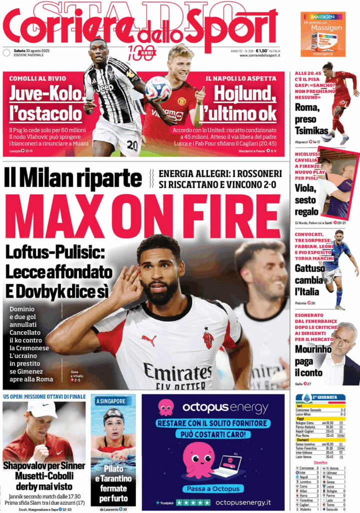 Hasło dnia to powrót Milanu po 2:0 w Lecce, z akcentem na duet Loftus-Cheek–Pulisic i trop napastnika („Dovbyk mówi tak”). U góry dwa równoległe fronty: Juve mierzy się z wymaganiami PSG przy Kolo Muanim, a saga Højlunda domyka się po stronie United. Roma sięga po Tsimikasa, Fiorentina dokłada kolejny transfer, a Mourinho zbiera konsekwencje spięć w Fenerbahçe.