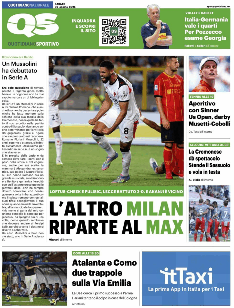 QS chwali odświeżony Milan po 2:0 w Lecce i dorzuca sygnał o ruchu w obronie („Akanji blisko”). Drugi wątek to rozpędzona Cremonese. Najważniejsze dla Bergamo: „Atalanta e Como, dwie pułapki na Via Emilia” – Dea jedzie do Parmy po pierwszy ligowy komplet.