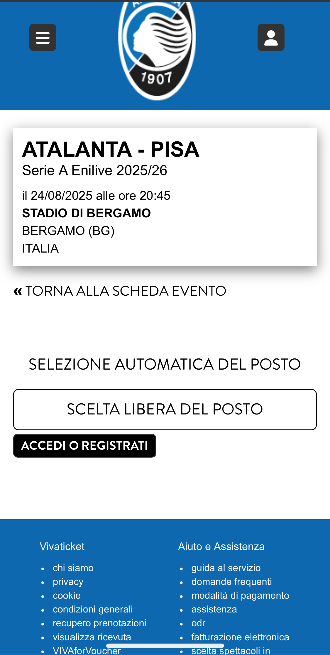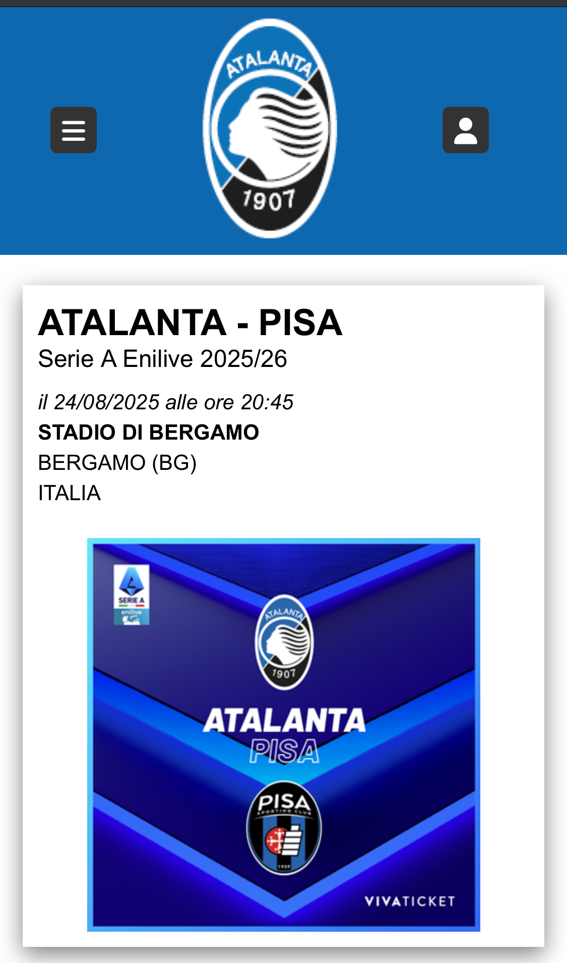 - Wejdź na stronę atalanta.it/biglietteria i tam znajdź interesujący event i przejdź za pomocą dedykowanego linku.