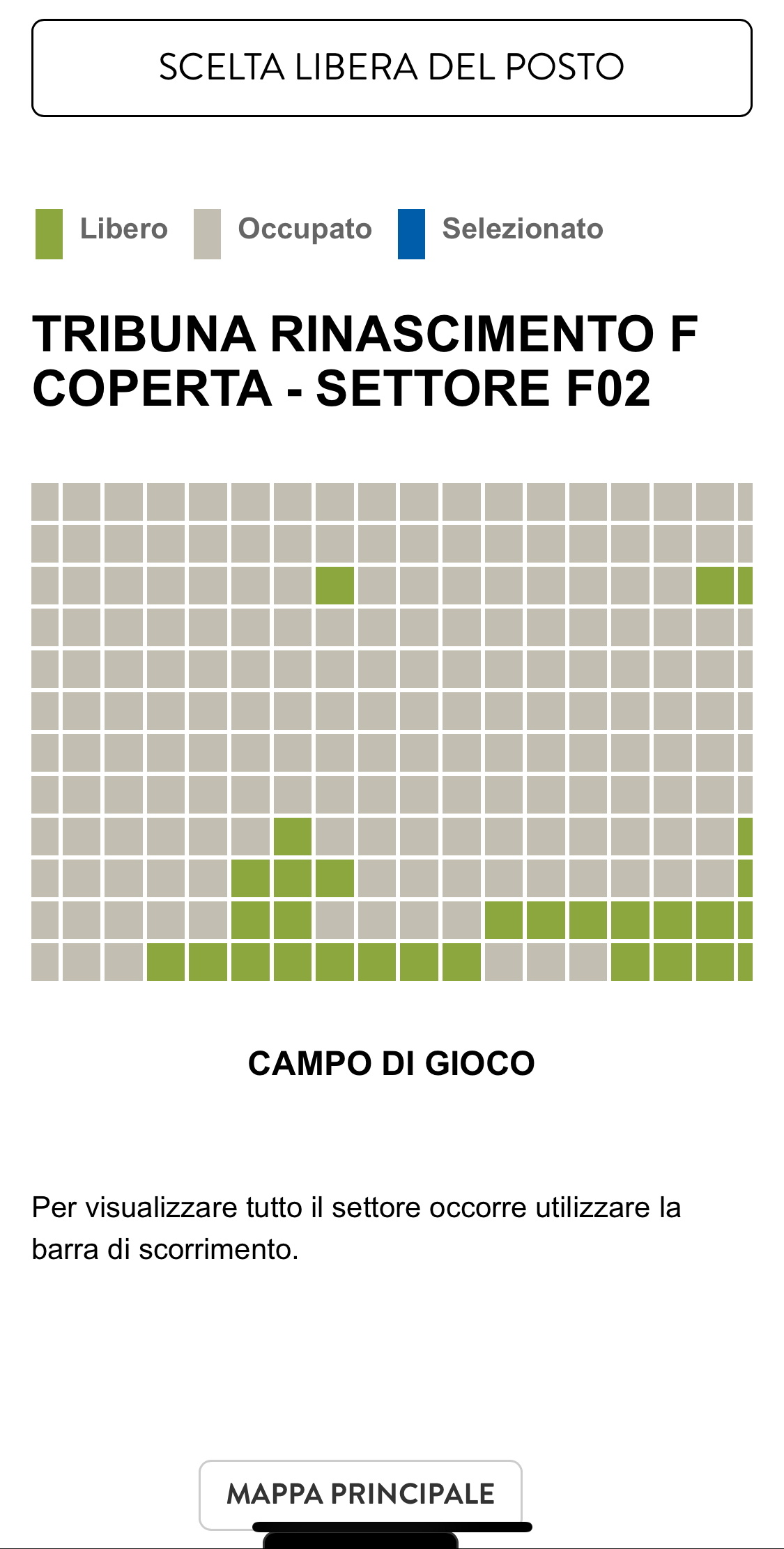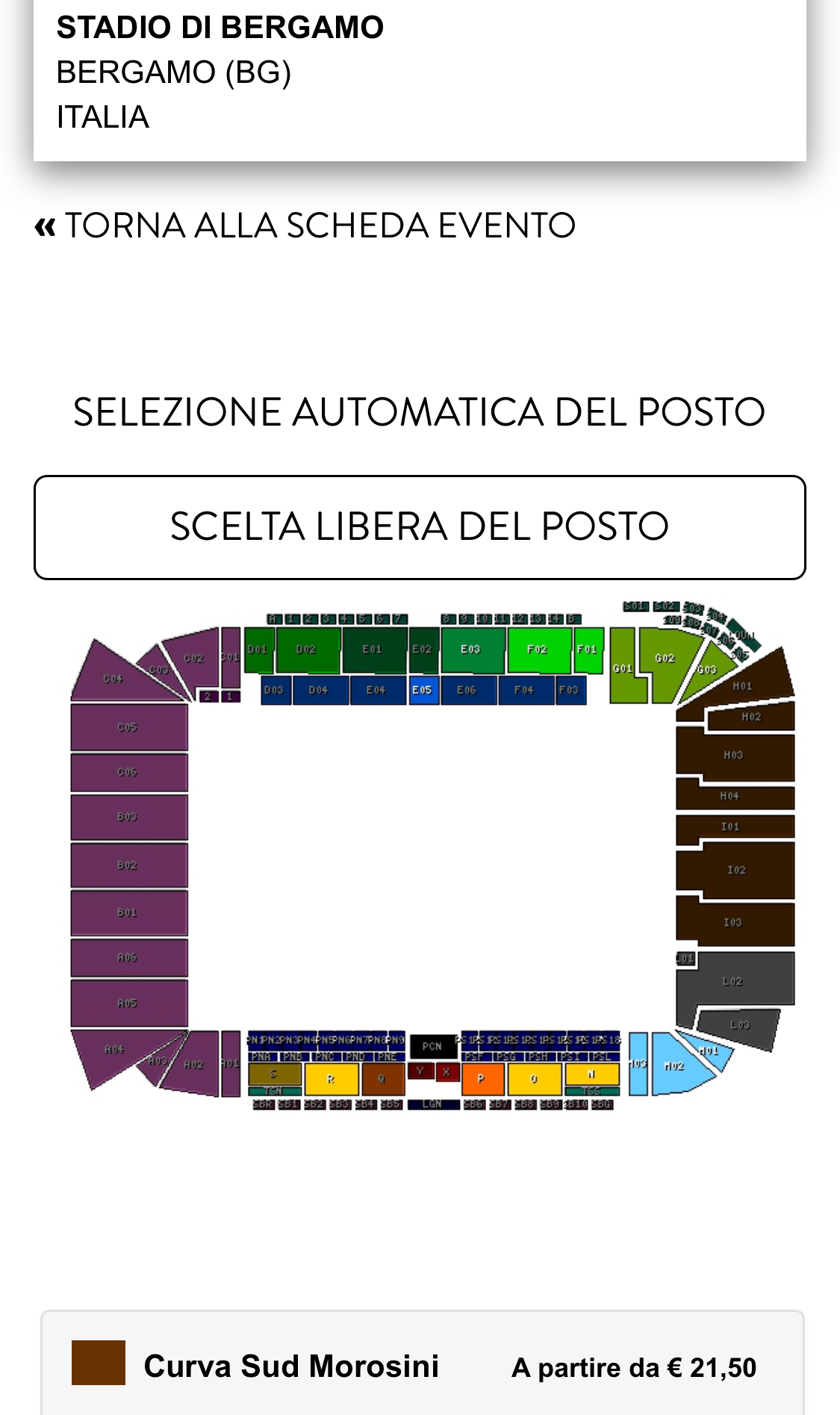 - Decydujemy w jaki sposób chcemy wybrać miejsce na stadionie: automatycznie (automatica) lub dowolnie (libera). W przypadku wyboru automatycznego dobieramy tylko trybunę, a system sam dobiera nam miejsca. Wybór dowolny to wybieranie konkretnych krzesełek na stadionie.
