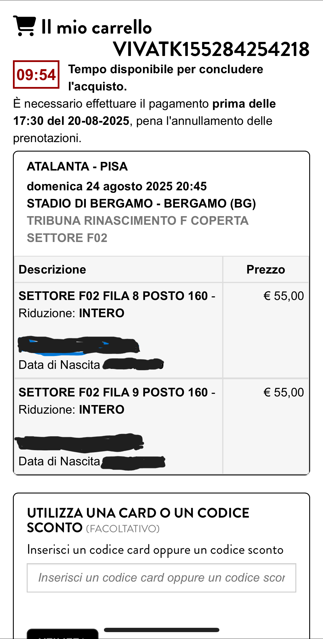 Podobnie jak w Polsce, gdzie często trzeba się zarejestrować i podać dane osobowe, aby wyrobić kartę kibica, w przypadku Atalanty bilety są rejestrowane na imię kupującego zgodnie z dekretem Ministra Spraw Wewnętrznych z 6/6/2005. Podczas zakupu online lub w punkcie sprzedaży konieczne jest podanie numeru dokumentu tożsamości, a przy wejściu na stadion należy okazać bilet, ważny dokument tożsamości i, w razie potrzeby, kartę lojalnościową, taką jak Dea Card. Dla niektórych meczów, zwłaszcza tych z ograniczeniami bezpieczeństwa, bilety mogą być dostępne tylko dla posiadaczy fizycznej karty Dea Card, co może wymagać wcześniejszej rejestracji w programie lojalnościowym klubu.