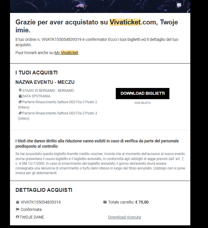 | Online (Vivaticket) | Zakup przez atalanta.vivaticket.it | Dane osobowe, dokument tożsamości |